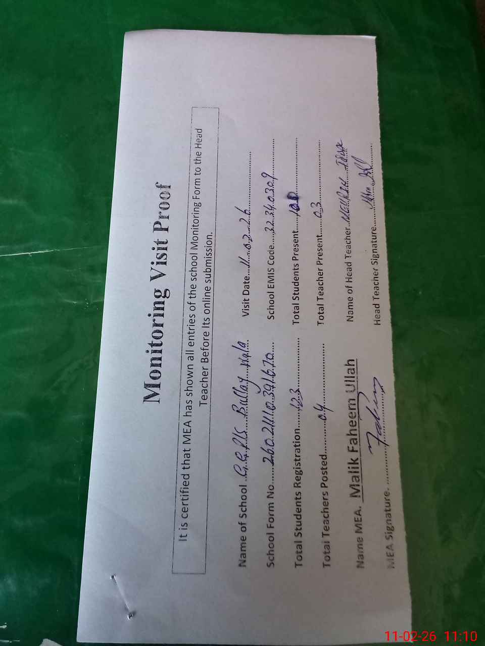 | Attendance Register | Head Teacher | MEA with School | Visit Proof |