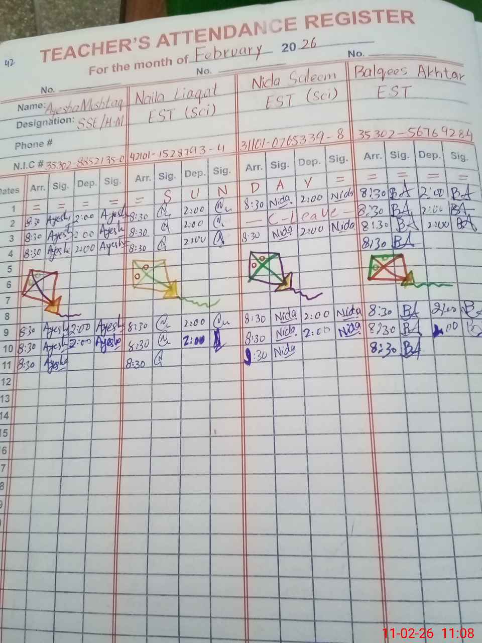 | CNIC | Full Name | Designation | R/C | Absence During Last Calender Month |