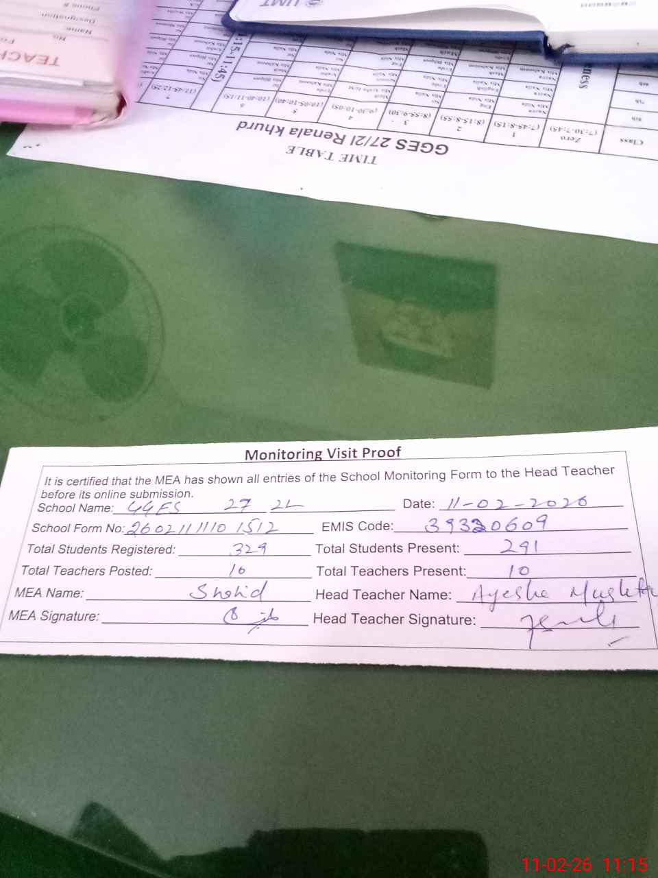 | Attendance Register | Head Teacher | MEA with School | Visit Proof |