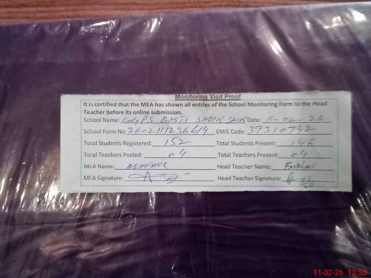 | Attendance Register | Head Teacher | MEA with School | Visit Proof |