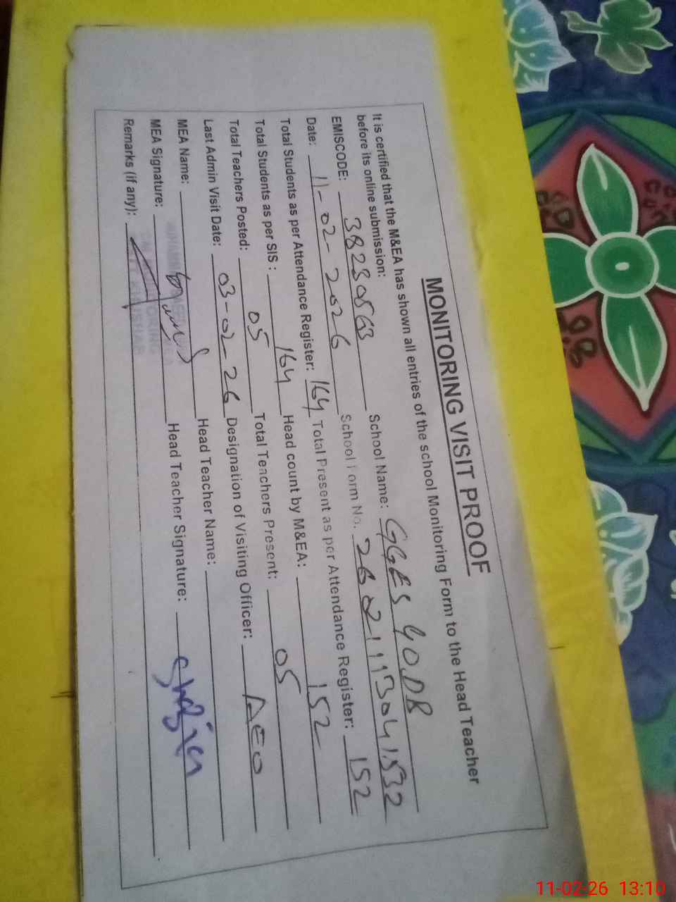| Remarks (Use Separate Page if Required): Students on SIS Qty 164 Last admin visit On 03 February 2026 by AEO | |||||