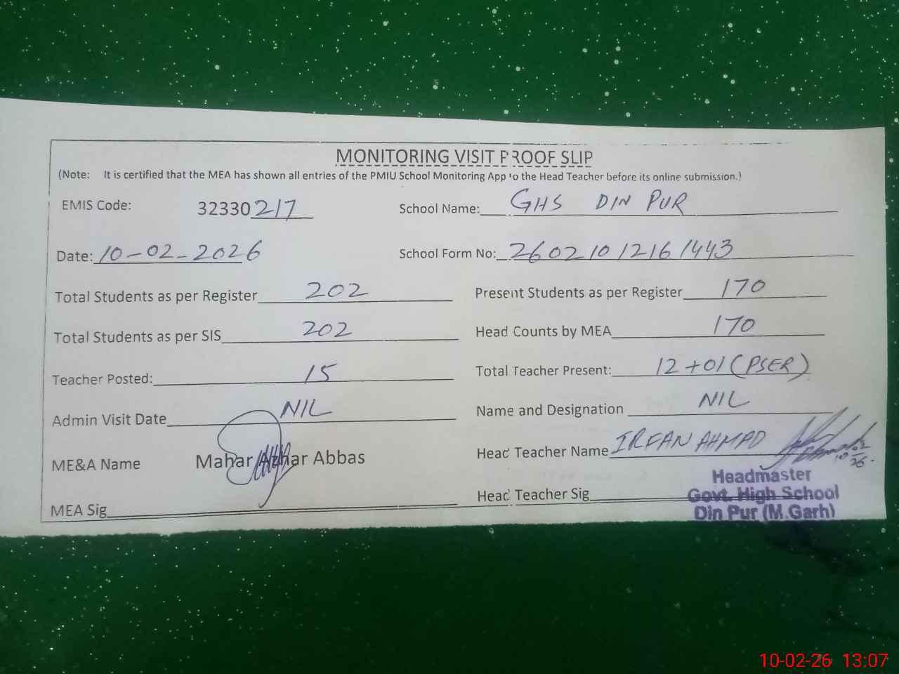 | Monitoring Date: 10-02-2026 | Start Time: 10-02-2026 12:16 PM | End Time: 10-02-2026 01:08 PM | Name of MEA: Ma**** Az**** Ab**** | |