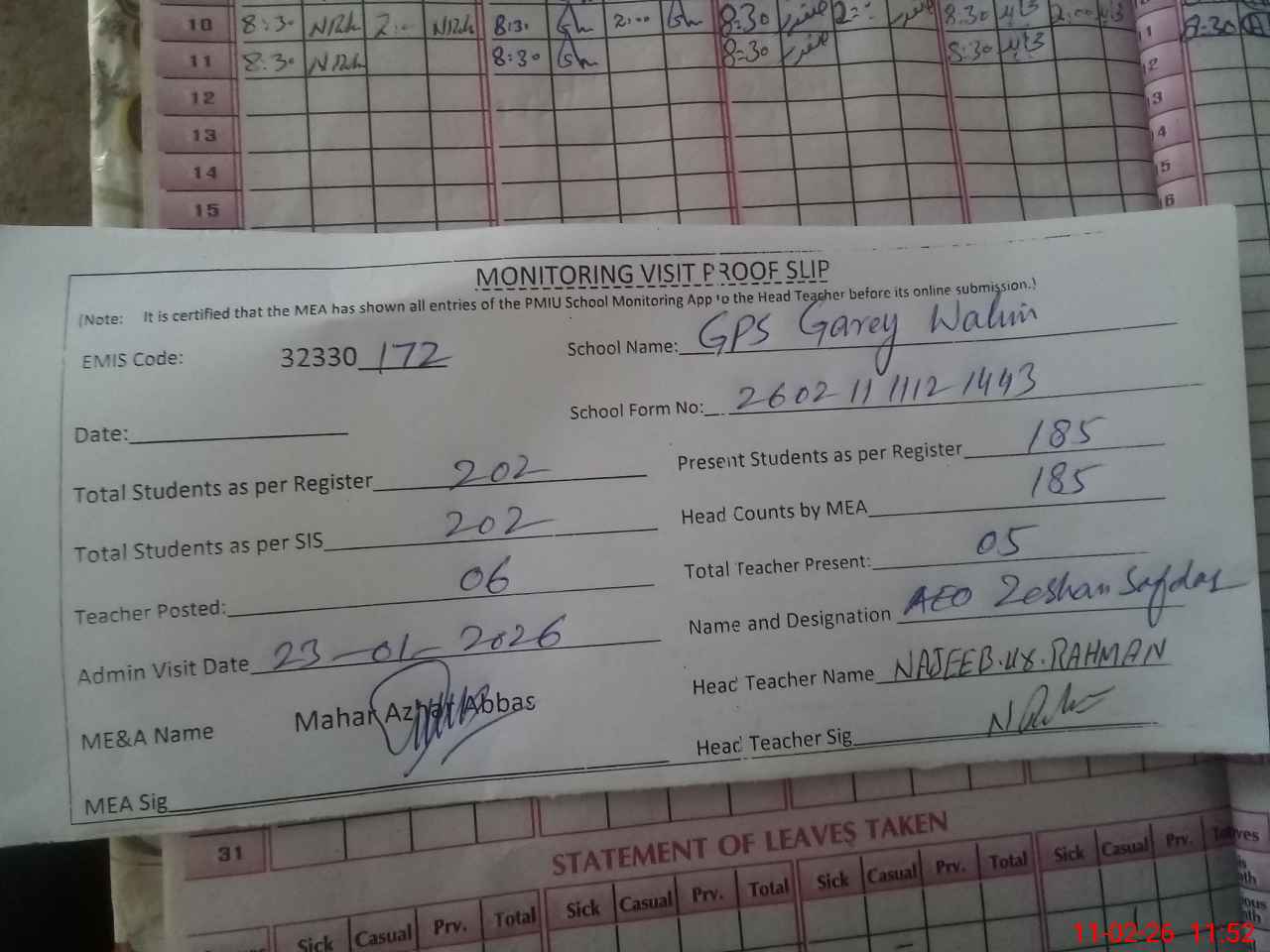 | Attendance Register | Head Teacher | MEA with School | Visit Proof |