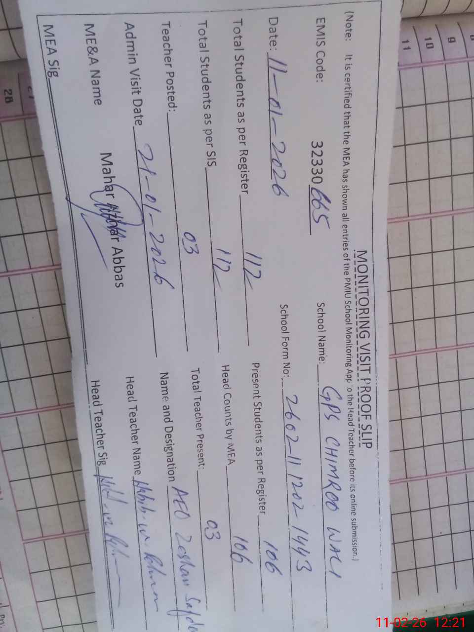 | Attendance Register | Head Teacher | MEA with School | Visit Proof |