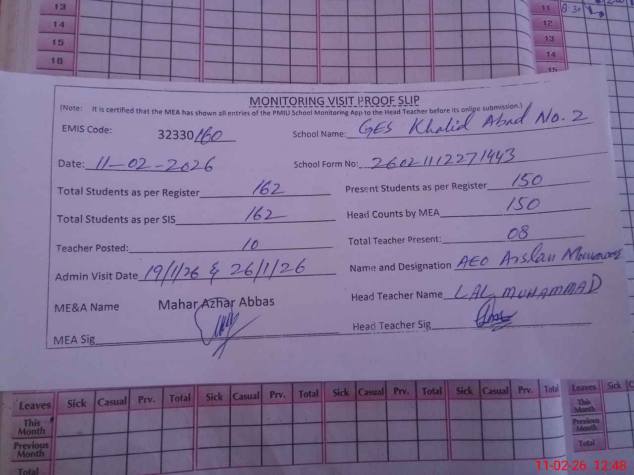 | EMIS Code: 32330160 | Name of School: GES KHALID ABAD NO 2 | |||