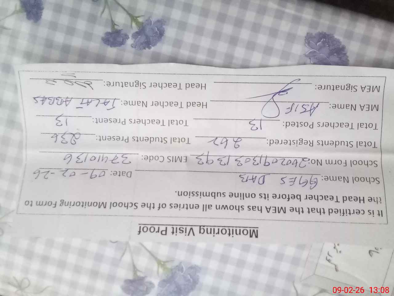 | Attendance Register | Head Teacher | MEA with School | Visit Proof |