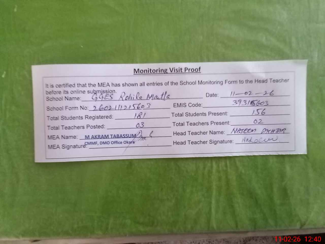 | Monitoring Date: 11-02-2026 | Start Time: 11-02-2026 12:15 PM | End Time: 11-02-2026 12:40 PM | Name of MEA: MU**** AK**** TA**** | |