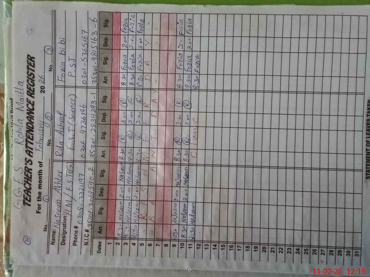 | CNIC | Full Name | Designation | R/C | Absence During Last Calender Month |