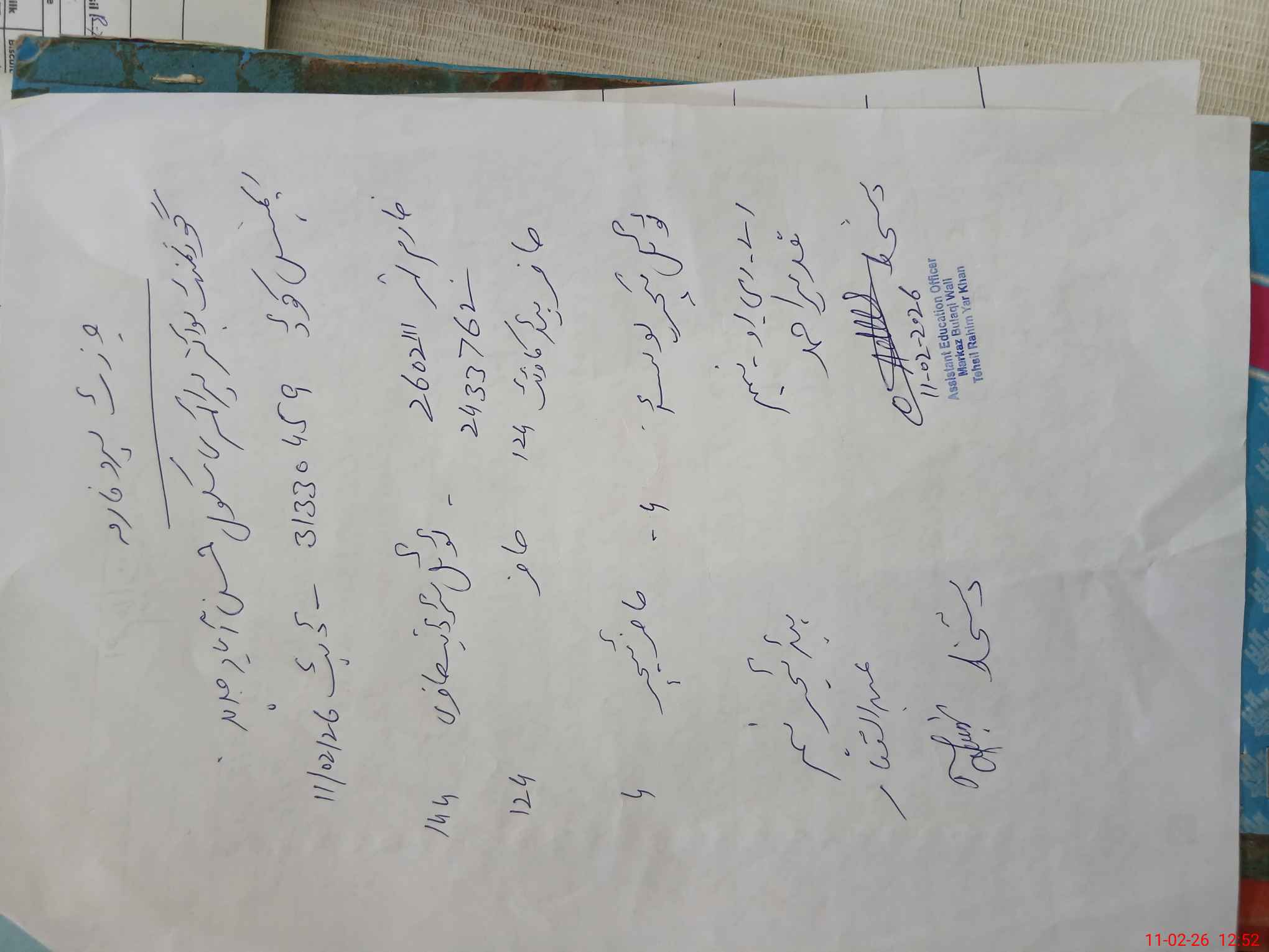 | Name: AB**** GH**** Designation: (School Headmaster's/Headmistress's) PST/PTC/JV Phone/Cell Number: 03**** |