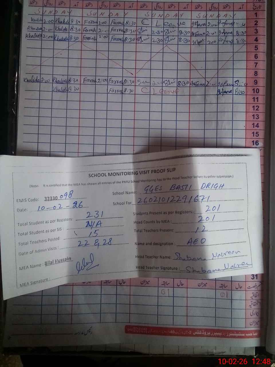 | Attendance Register | Head Teacher | MEA with School | Visit Proof |