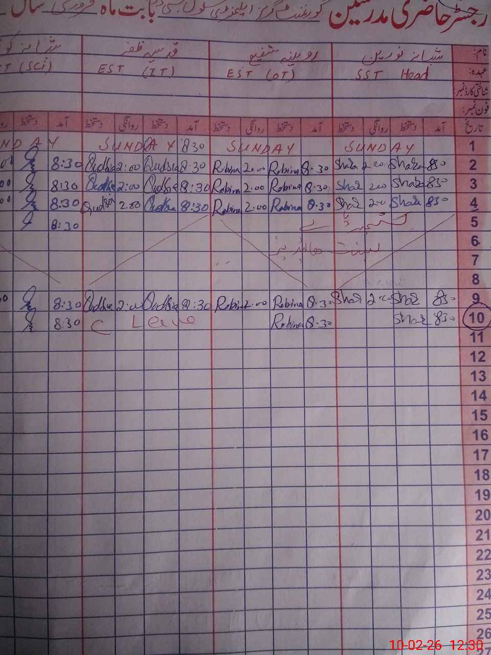 | CNIC | Full Name | Designation | R/C | Absence During Last Calender Month |