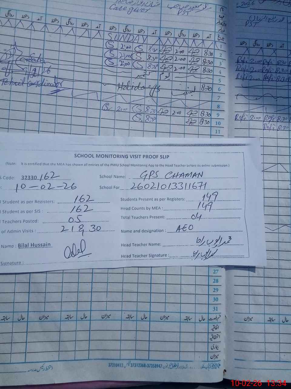 | Attendance Register | Head Teacher | MEA with School | Visit Proof |