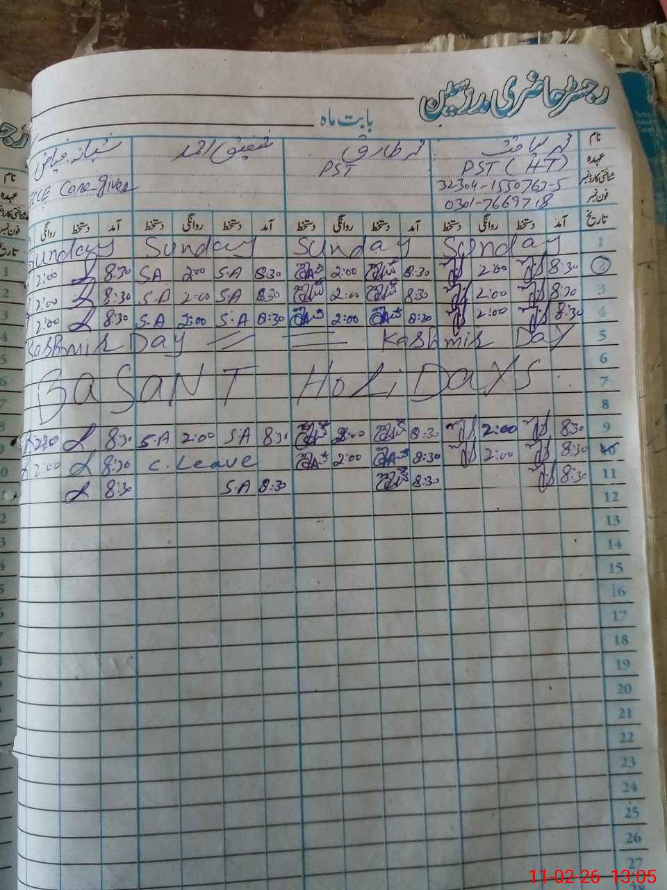 | CNIC | Full Name | Designation | R/C | Absence During Last Calender Month |