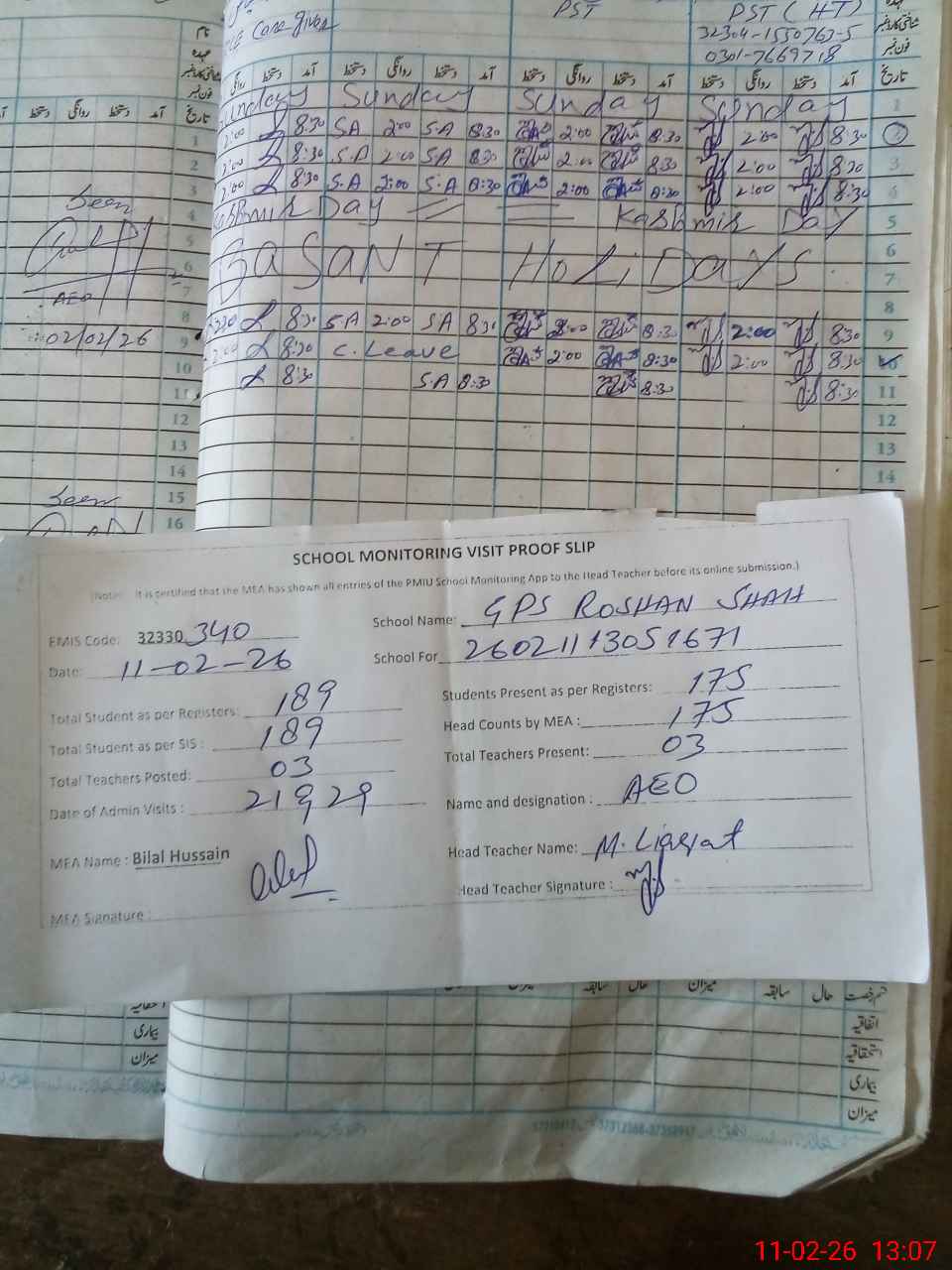 | Attendance Register | Head Teacher | MEA with School | Visit Proof |