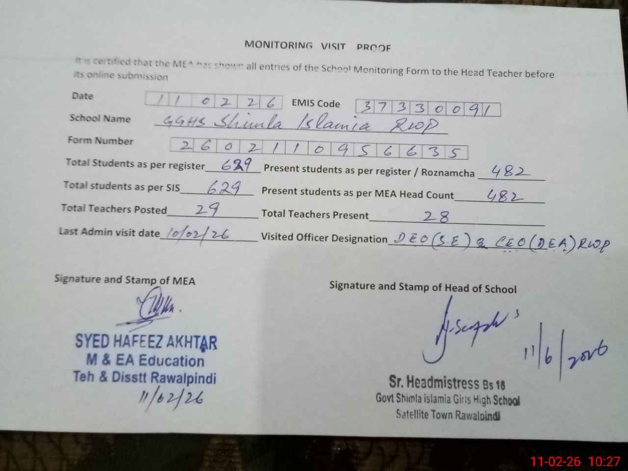 | Monitoring Date: 11-02-2026 | Start Time: 11-02-2026 09:28 AM | End Time: 11-02-2026 10:31 AM | Name of MEA: Sy**** Ha**** Ak**** | |