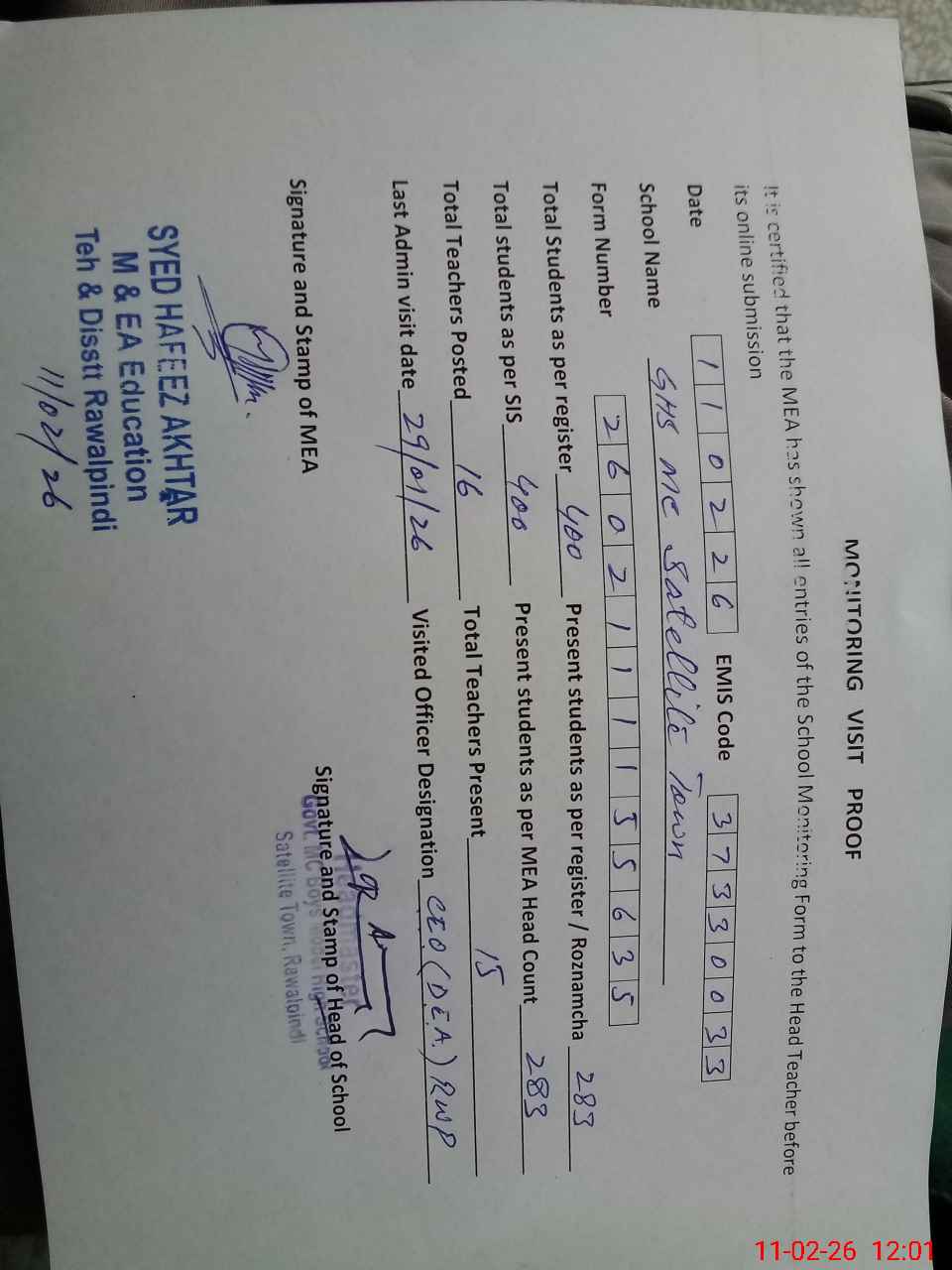 | Certified that this School was Inspected by the Undersigned MEA/DMO Today and the Information Stated Above is as Per Record. | |||||