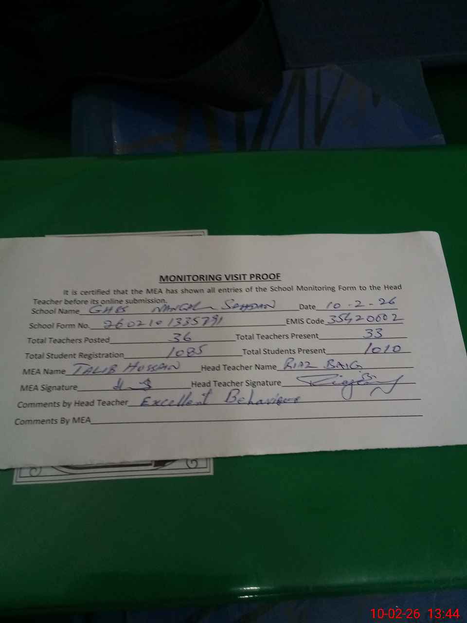 | Certified that this School was Inspected by the Undersigned MEA/DMO Today and the Information Stated Above is as Per Record. | |||||