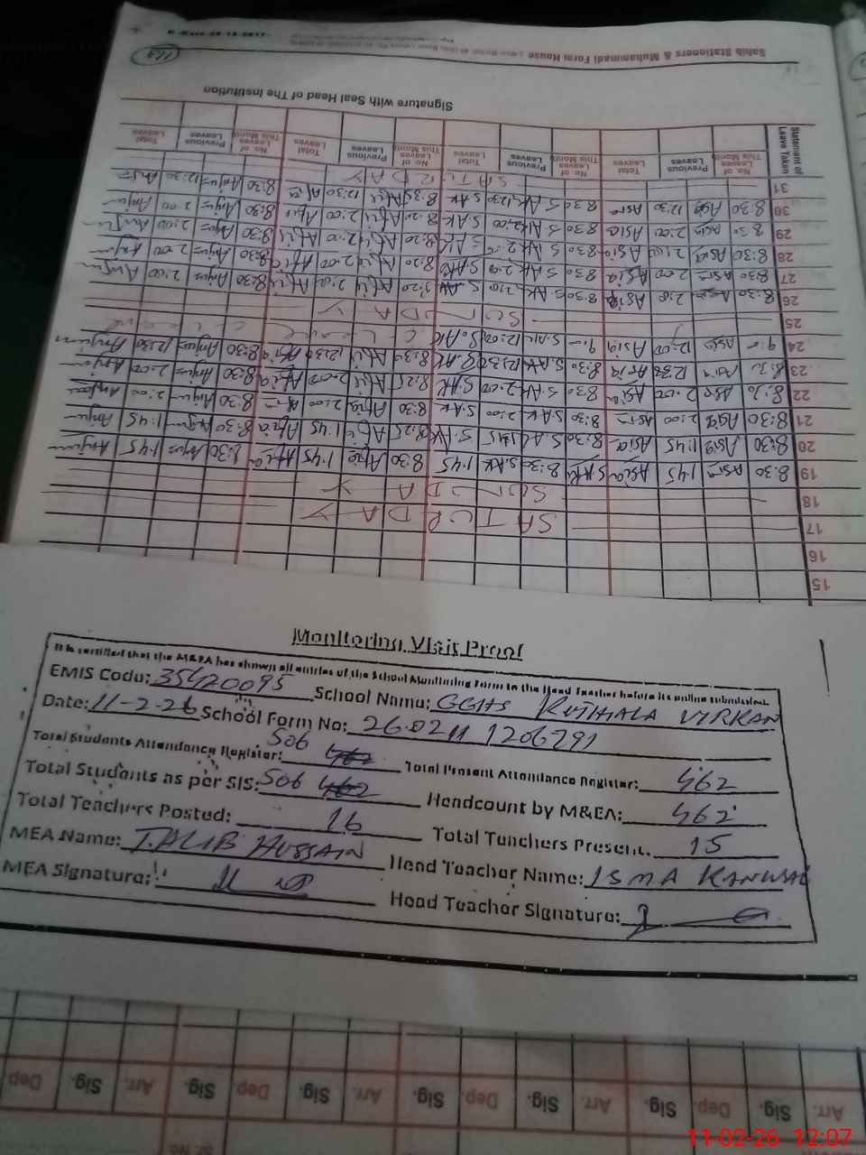 | Attendance Register | Head Teacher | MEA with School | Visit Proof |