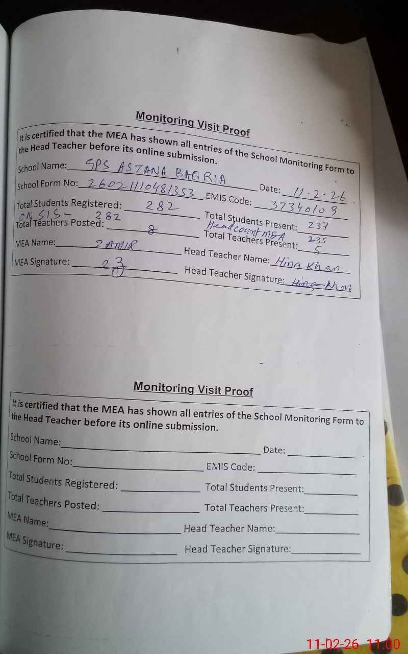 | Monitoring Date: 11-02-2026 | Start Time: 11-02-2026 10:25 AM | End Time: 11-02-2026 11:00 AM | Name of MEA: Za**** Ah**** | |