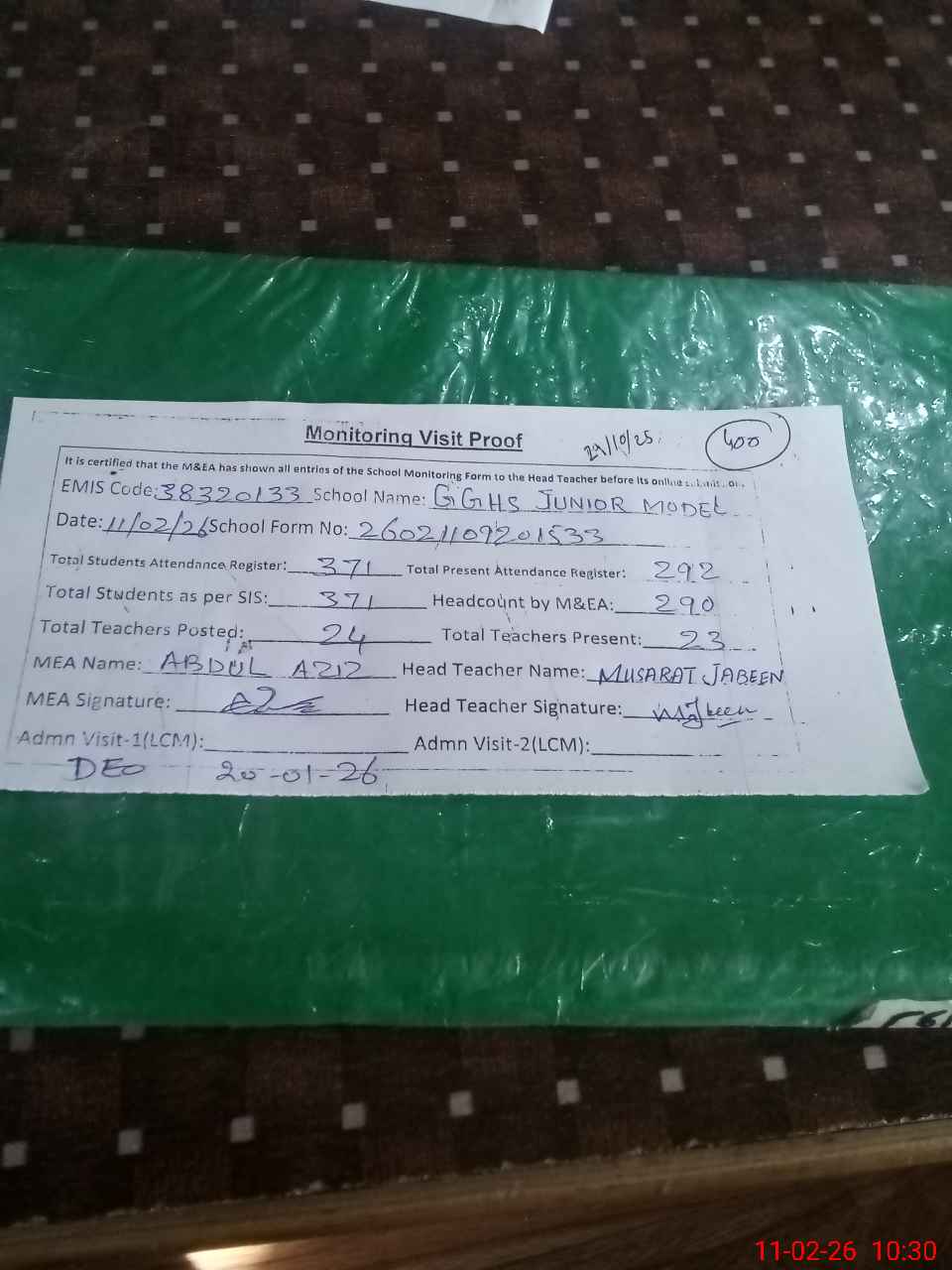 | Attendance Register | Head Teacher | MEA with School | Visit Proof |