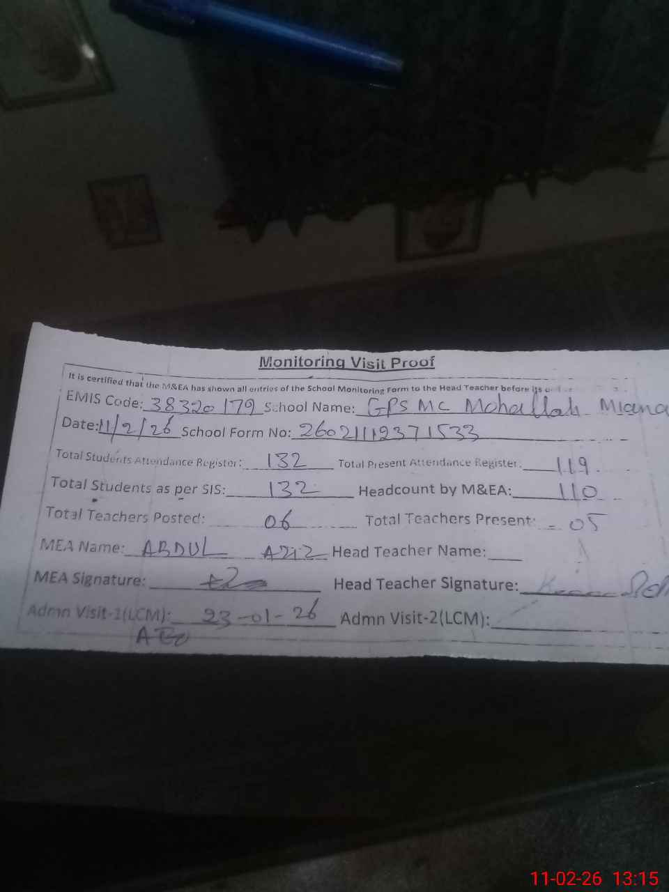 | Attendance Register | Head Teacher | MEA with School | Visit Proof |