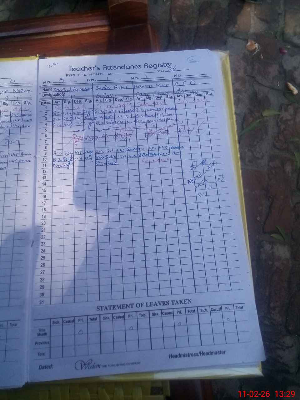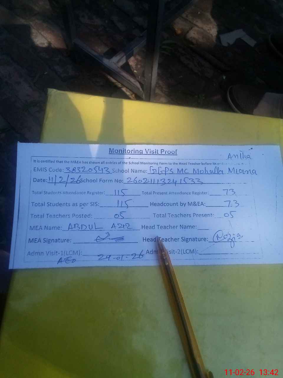 | Attendance Register | Head Teacher | MEA with School | Visit Proof |