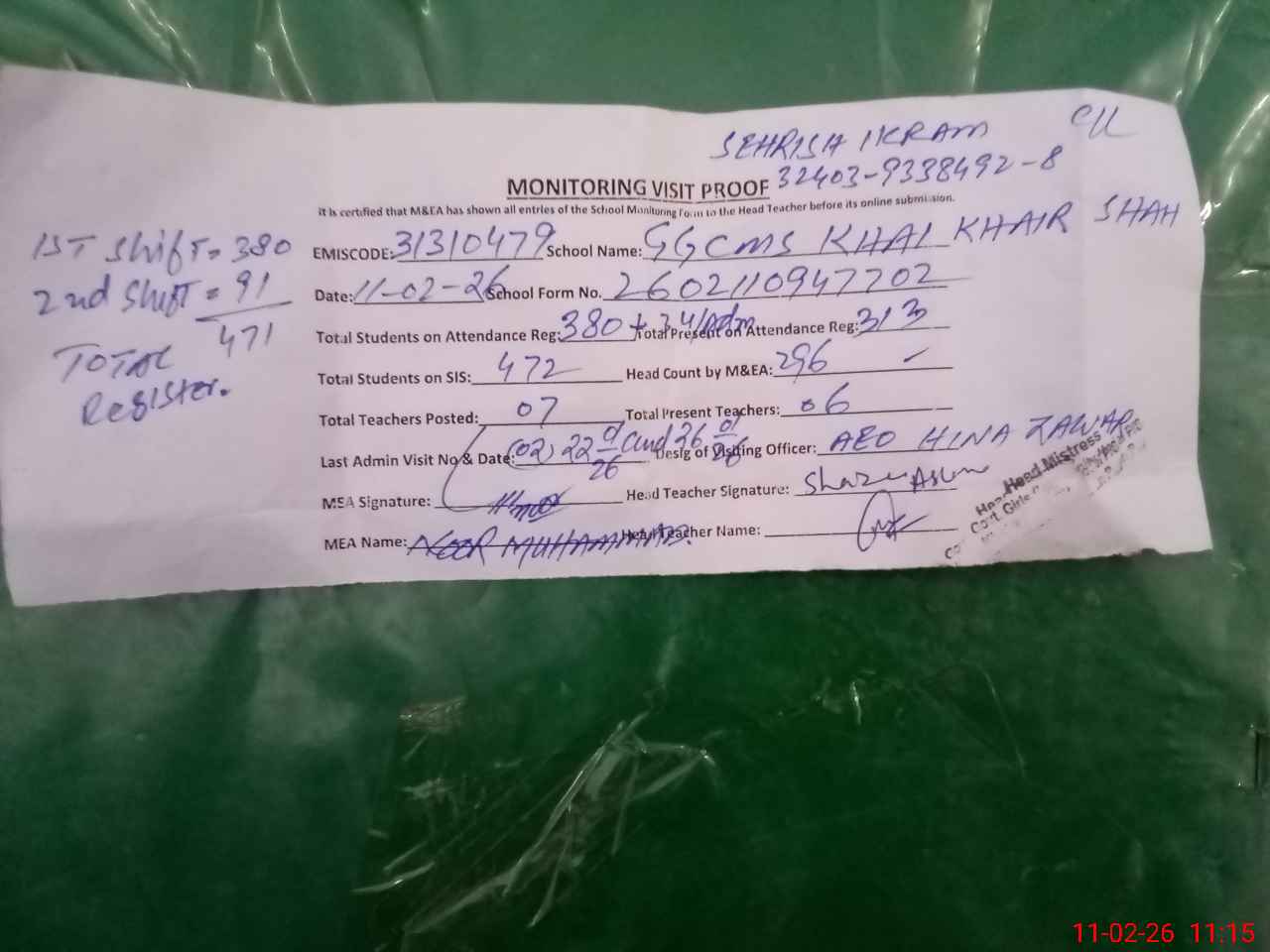 | EMIS Code: 31310479 | Name of School: GGCMS KHAI KHAIR SHAH (After Noon) | |||