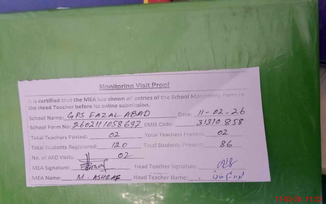 | EMIS Code: 31310858 | Name of School: GPS FAZAL ABAD | |||