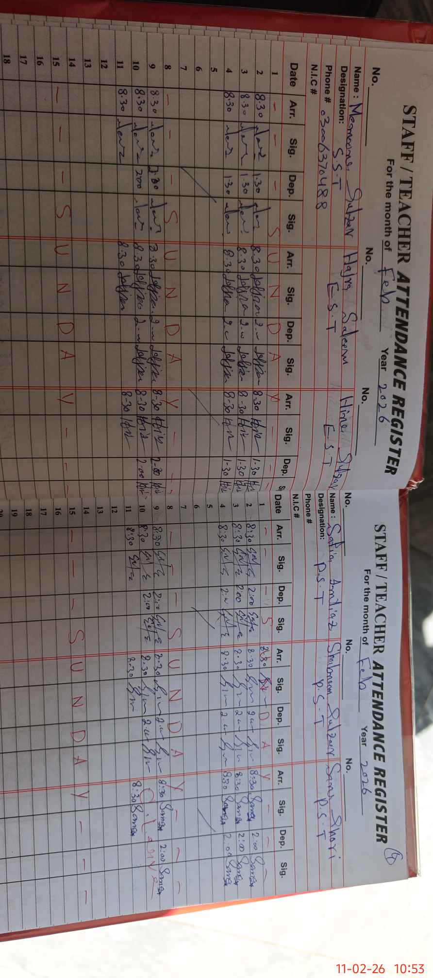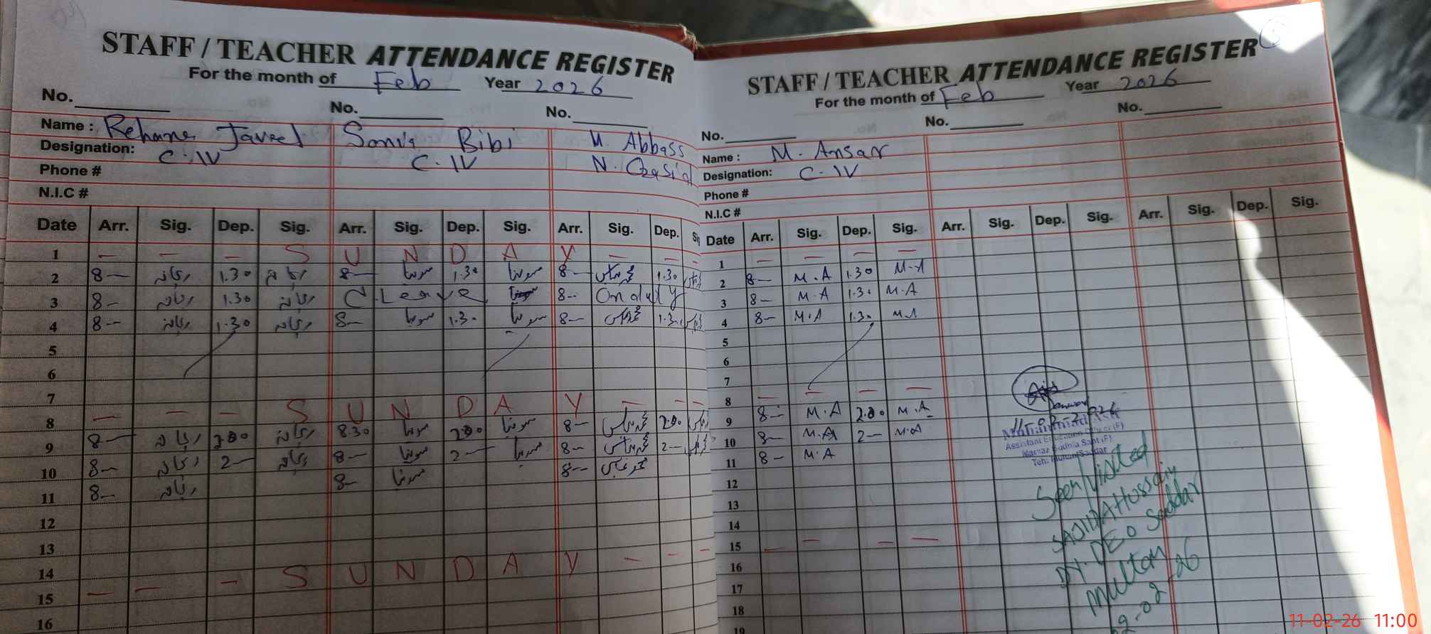 | CNIC | Full Name | Designation | R/C | Absence During Last Calender Month |