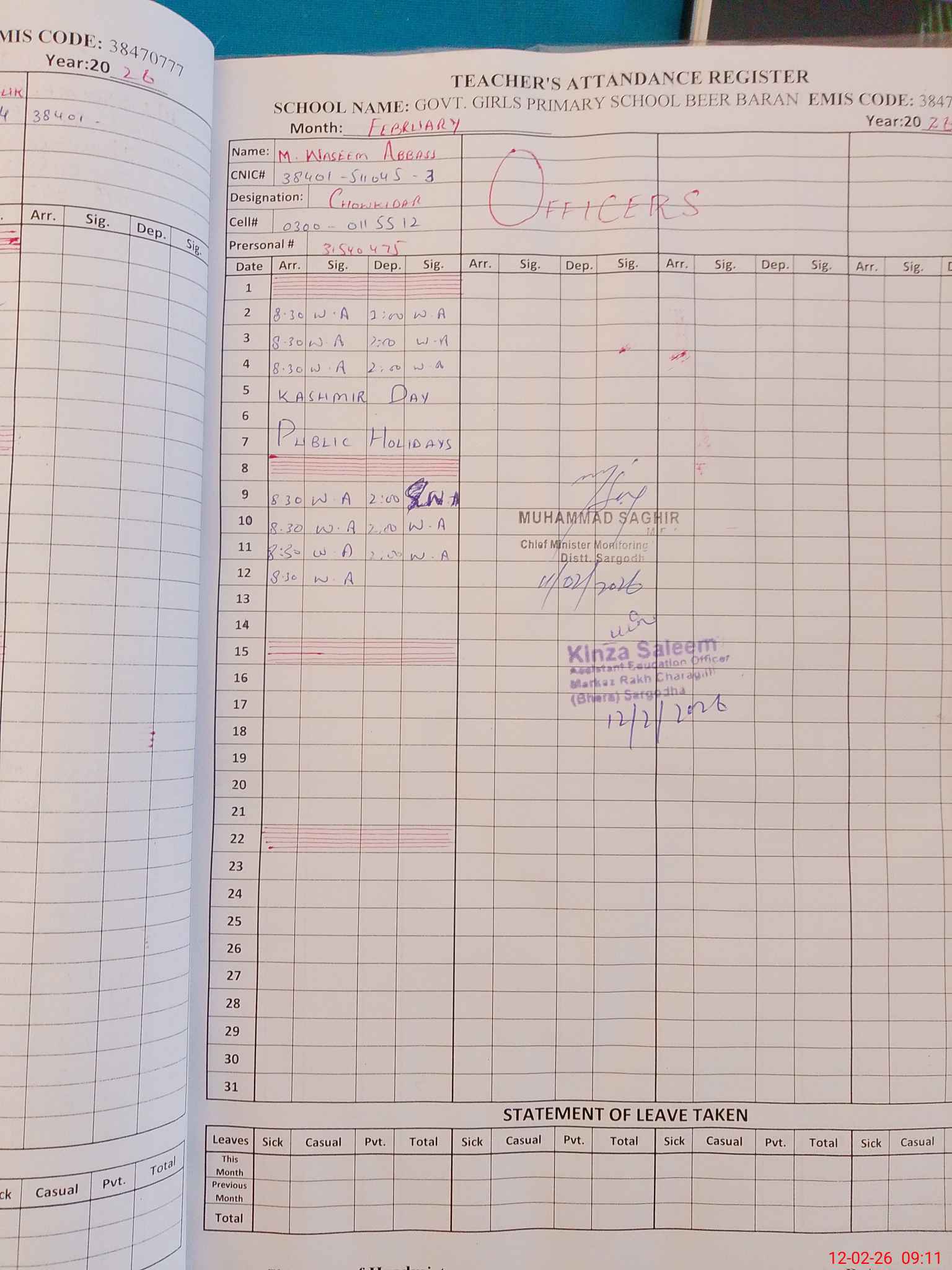 | CNIC | Full Name | Designation | R/C | Absence During Last Calender Month |
