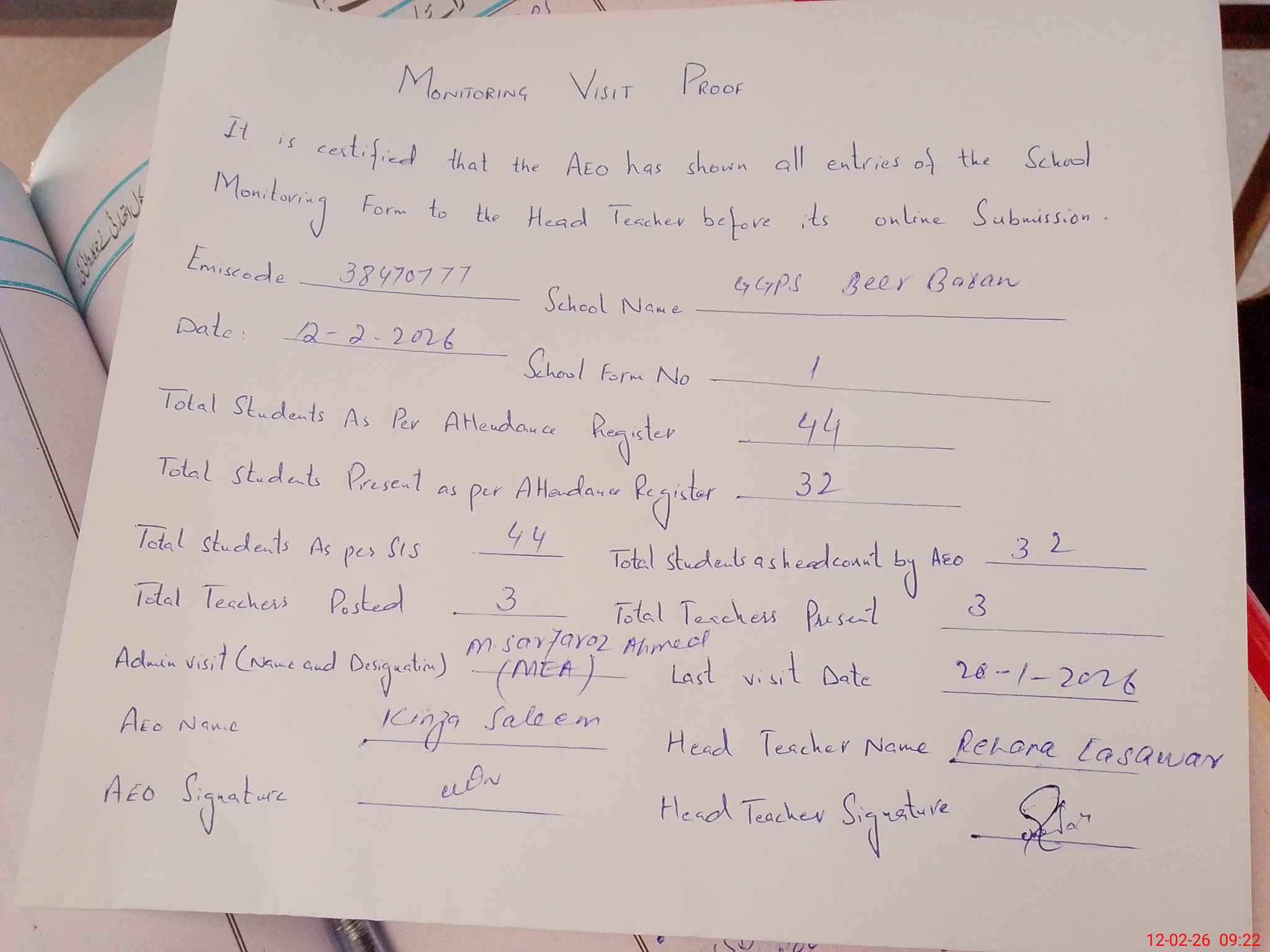 | Attendance Register | Head Teacher | MEA with School | Visit Proof |