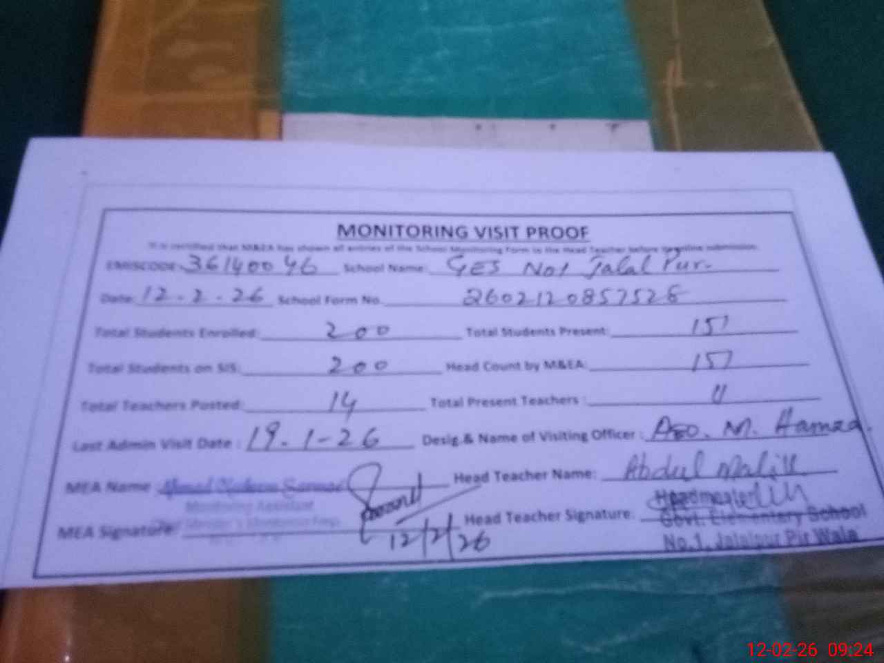 | EMIS Code: 36140046 | Name of School: GES JALAL PUR PIRWALA NO.1 WARD NO 4 | |||
