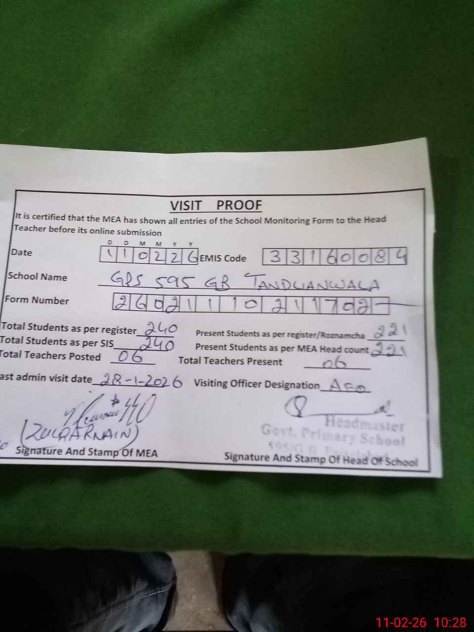 | Attendance Register | Head Teacher | MEA with School | Visit Proof |
