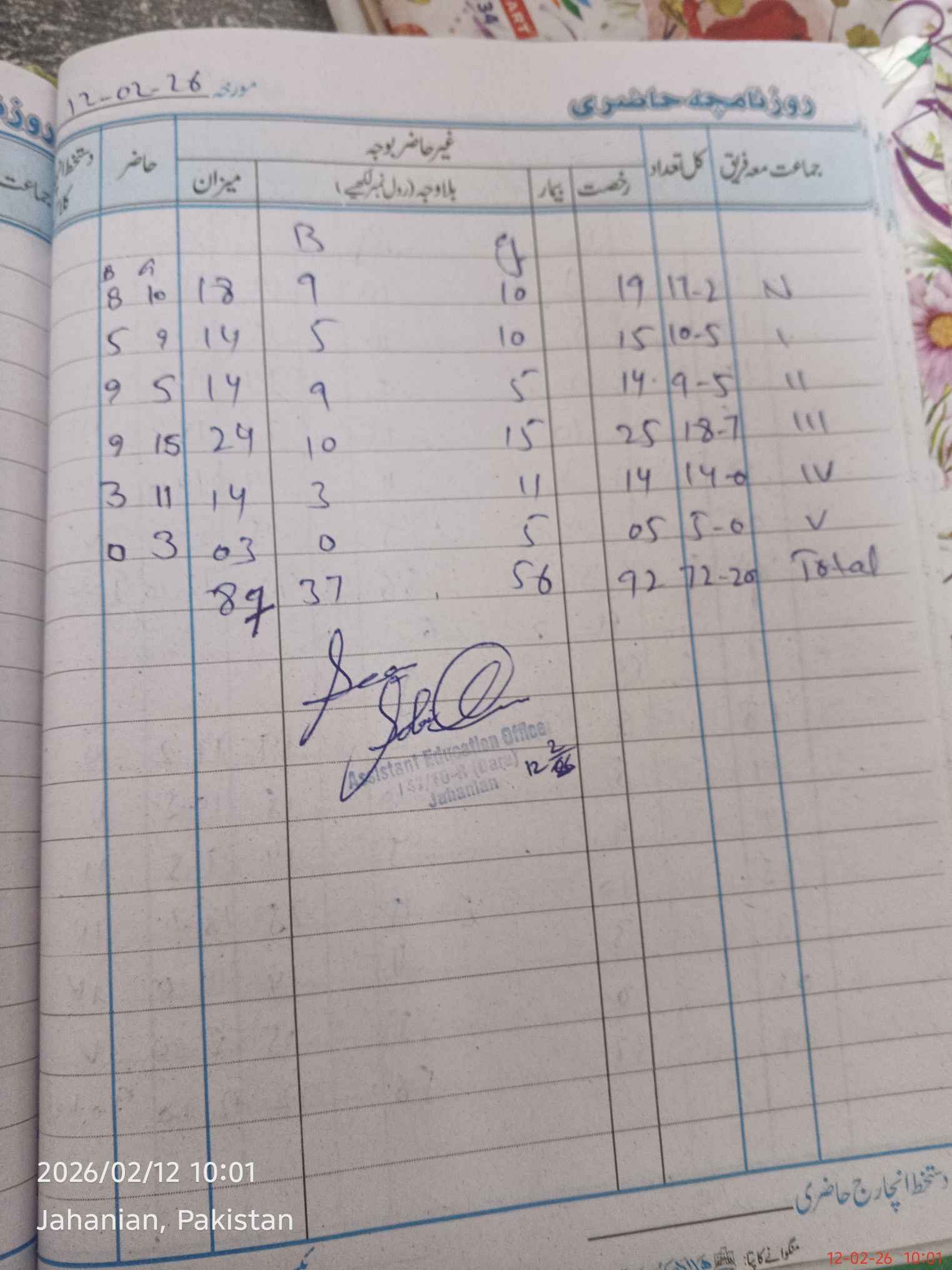 | District: KHANEWAL | Tehsil: JAHANIAN | Markaz: 147/10-R(BARA) - FEMALE | Level: Primary | |