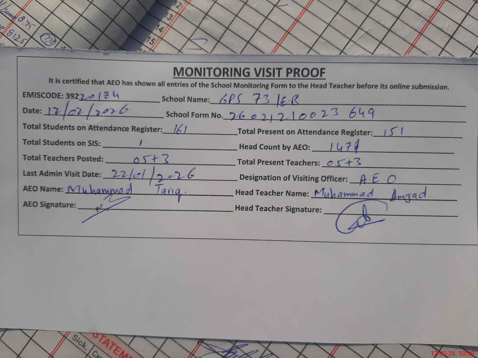 | Attendance Register | Head Teacher | MEA with School | Visit Proof |