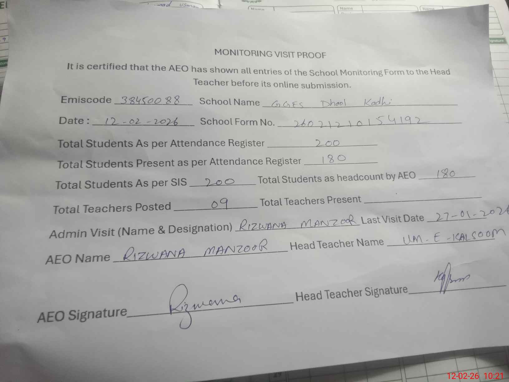 | Attendance Register | Head Teacher | MEA with School | Visit Proof |