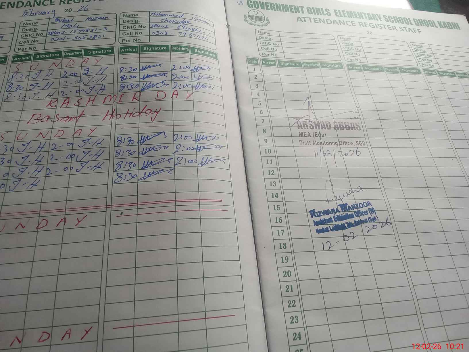 | CNIC | Full Name | Designation | R/C | Absence During Last Calender Month |