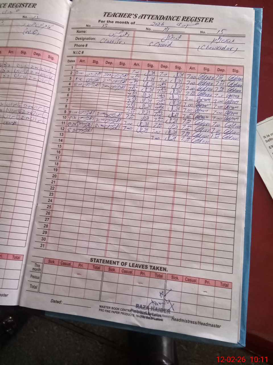 | CNIC | Full Name | Designation | R/C | Absence During Last Calender Month |