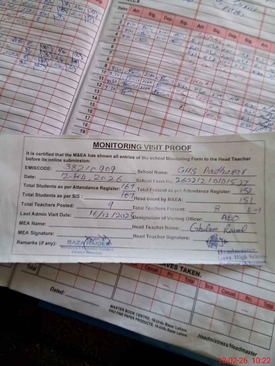 | Attendance Register | Head Teacher | MEA with School | Visit Proof |