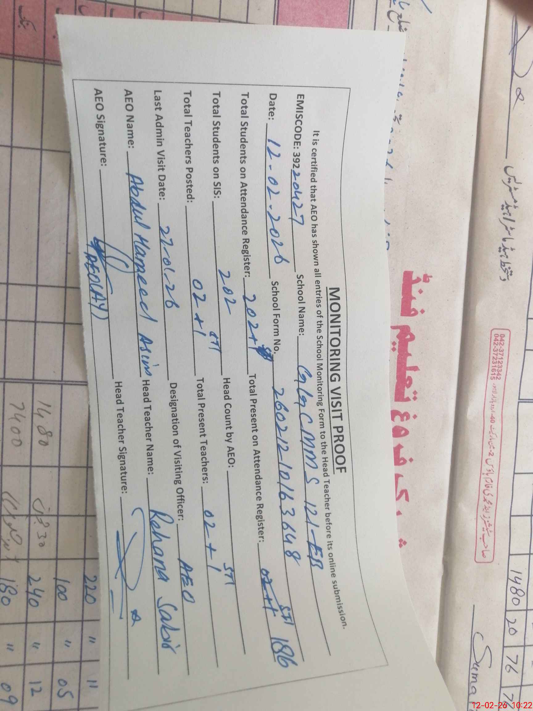| Certified that this School was Inspected by the Undersigned MEA/DMO Today and the Information Stated Above is as Per Record. | |||||