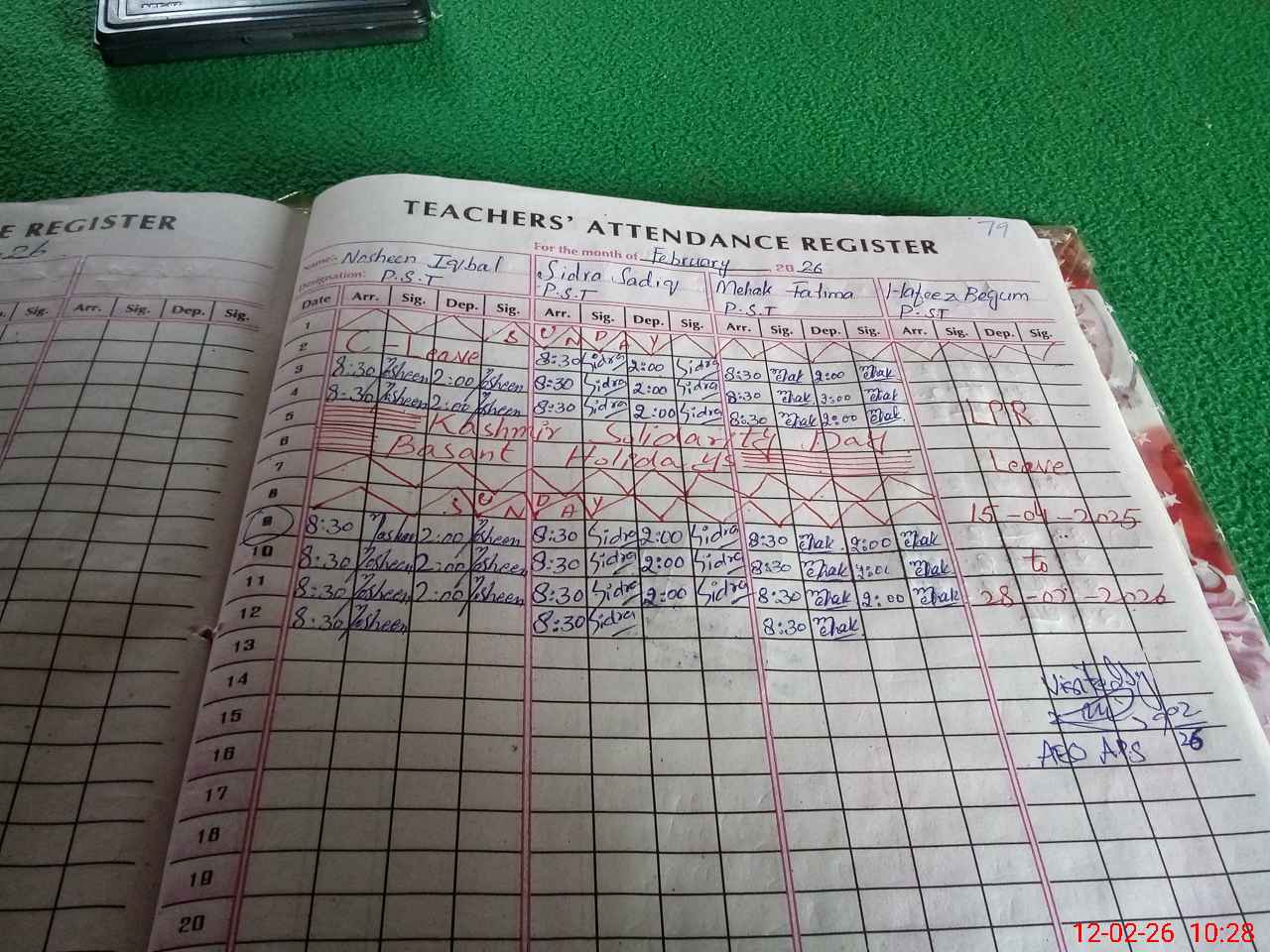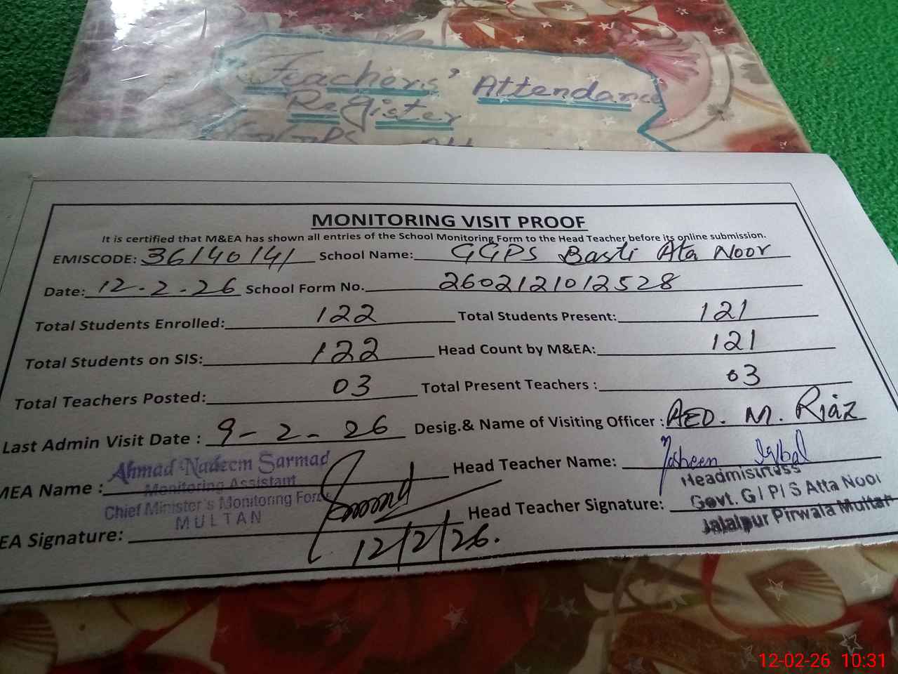 | Attendance Register | Head Teacher | MEA with School | Visit Proof |