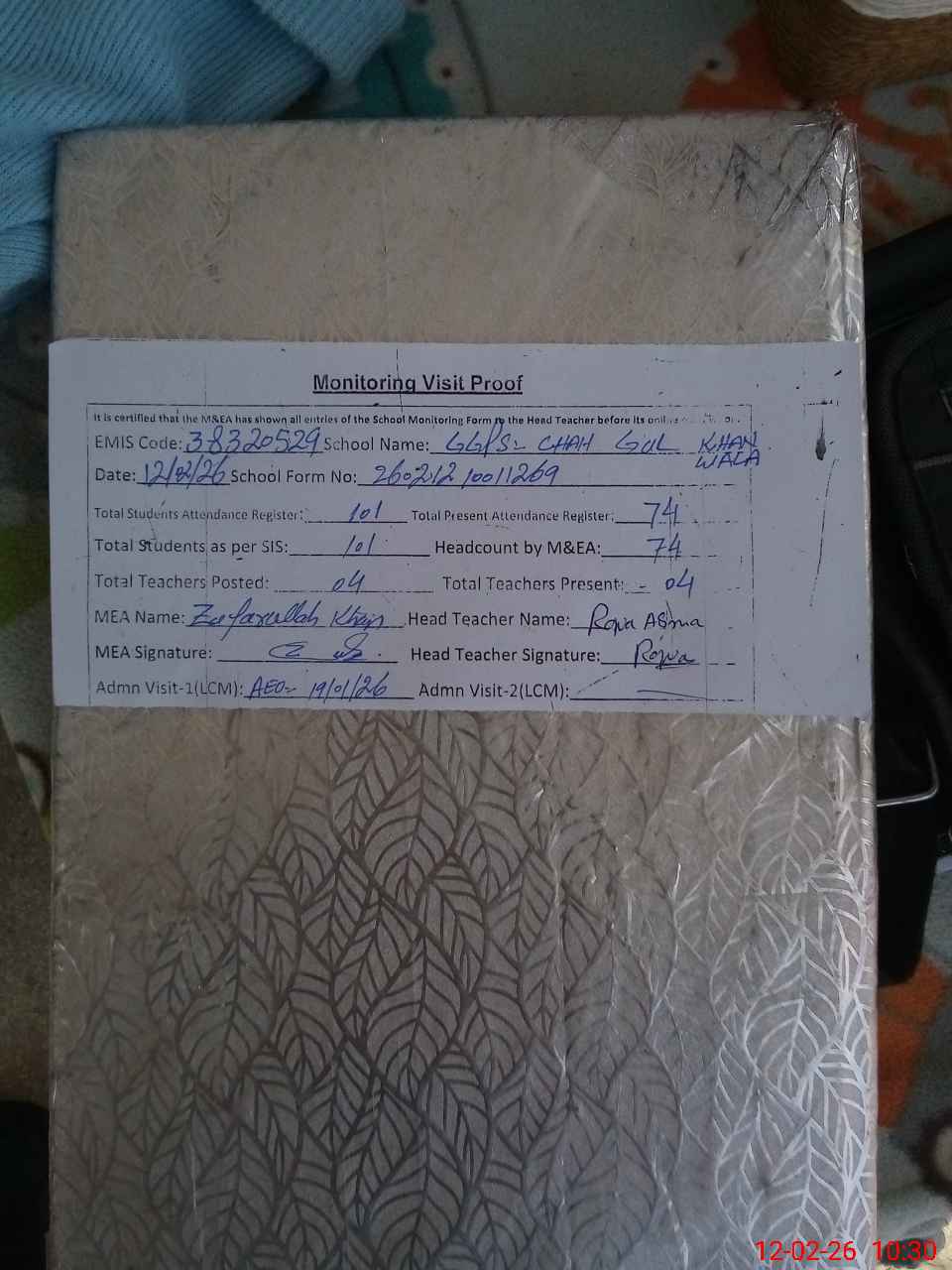| Attendance Register | Head Teacher | MEA with School | Visit Proof |