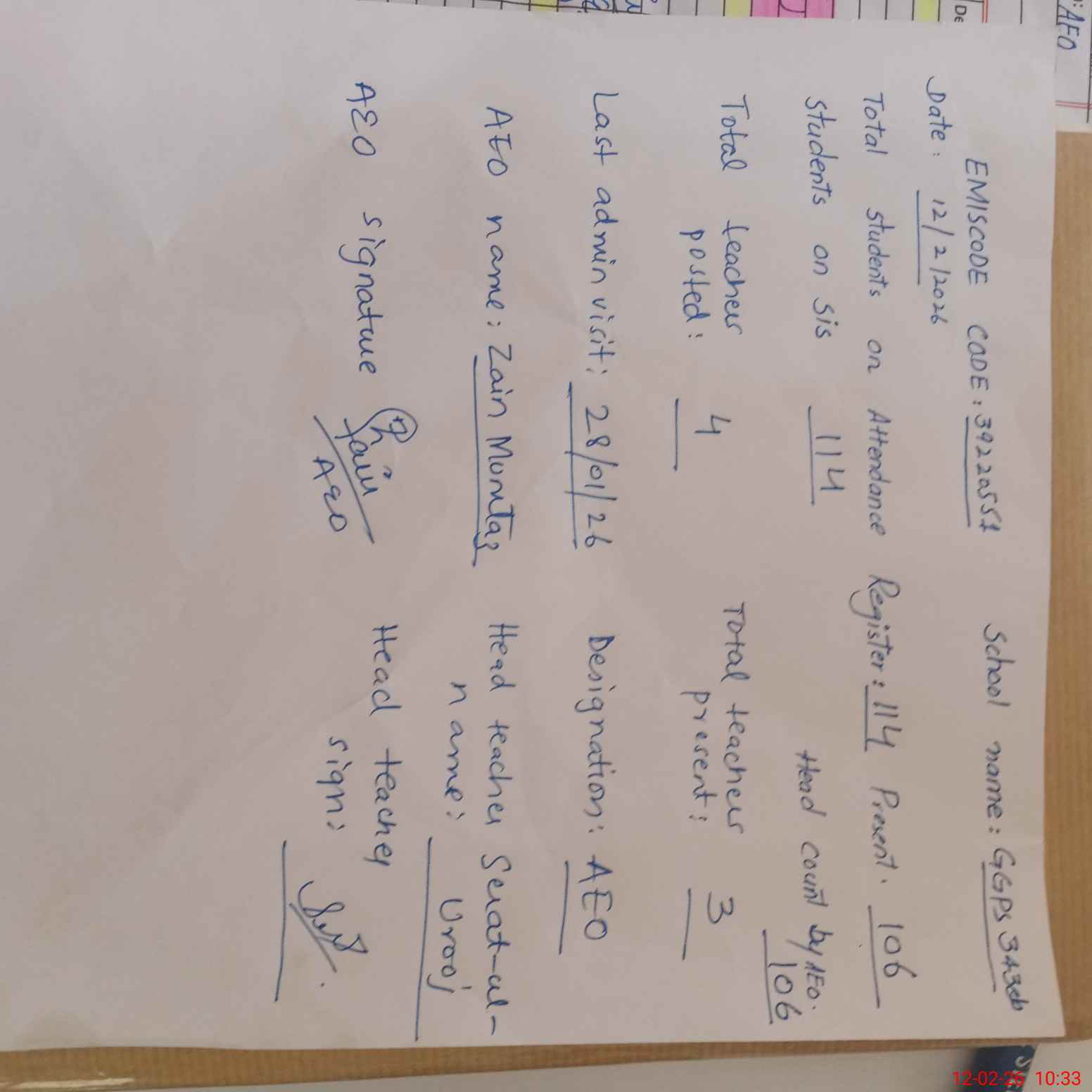 | Attendance Register | Head Teacher | MEA with School | Visit Proof |