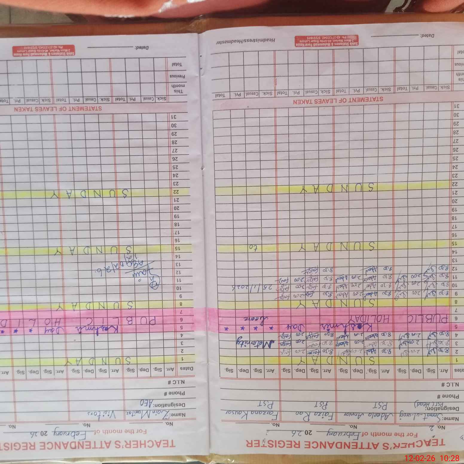 | CNIC | Full Name | Designation | R/C | Absence During Last Calender Month |