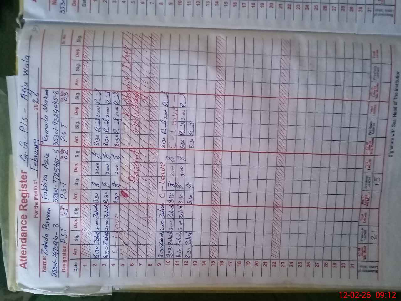 | CNIC | Full Name | Designation | R/C | Absence During Last Calender Month |