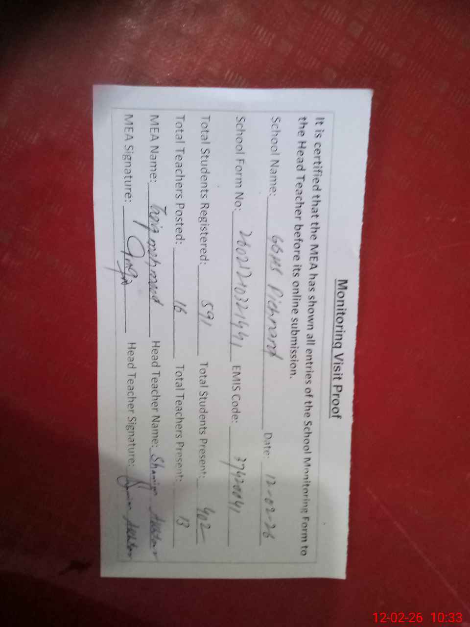 | Attendance Register | Head Teacher | MEA with School | Visit Proof |