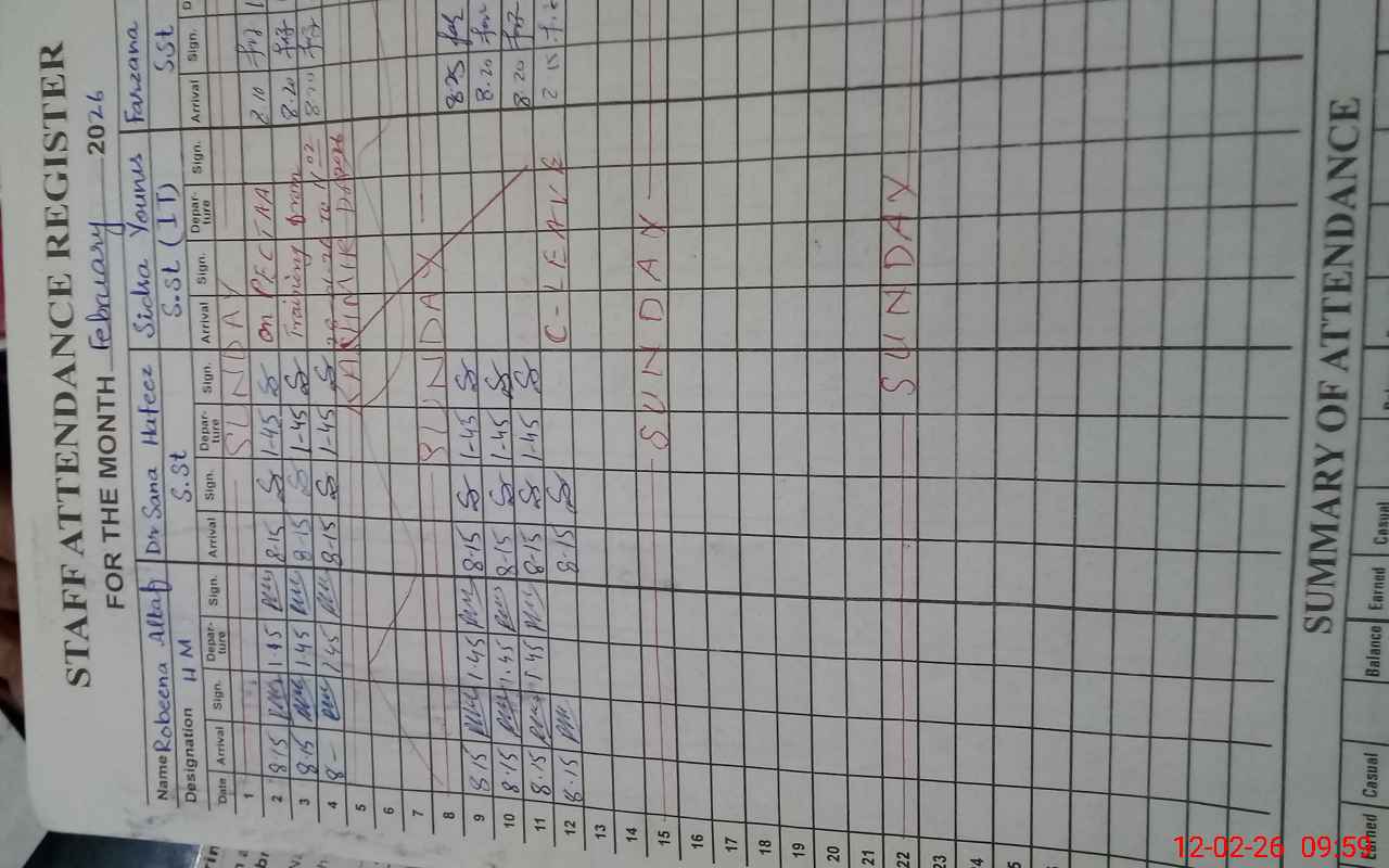 | Remarks (Use Separate Page if Required): 01 teacher named Shazia Irum SST marked absent due to came at 1000am. some students attendance registers are not available. | |||||
