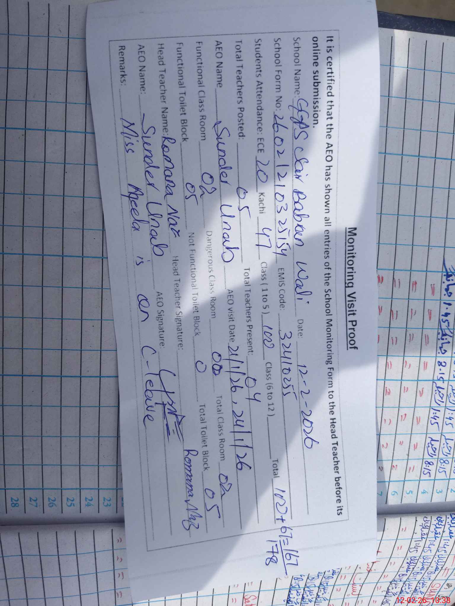 | Attendance Register | Head Teacher | MEA with School | Visit Proof |