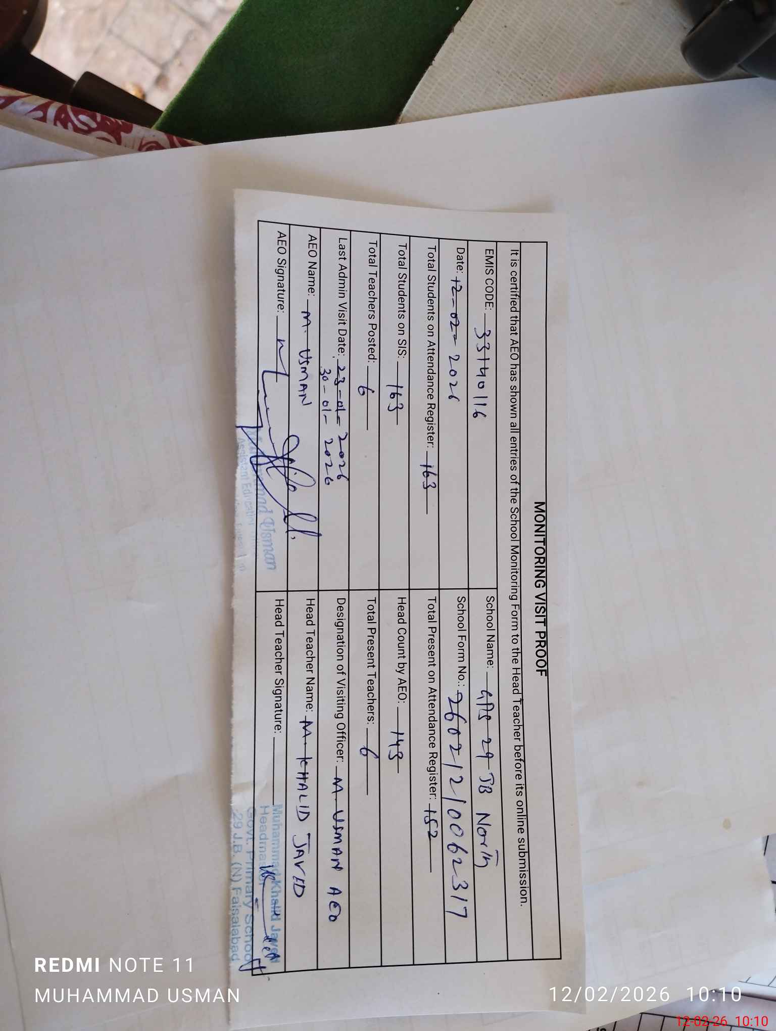 | Attendance Register | Head Teacher | MEA with School | Visit Proof |