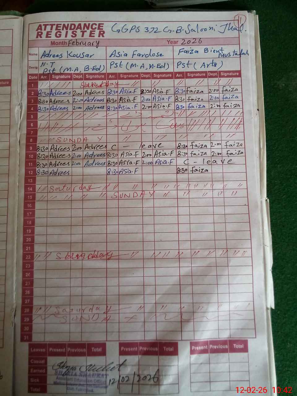 | CNIC | Full Name | Designation | R/C | Absence During Last Calender Month |